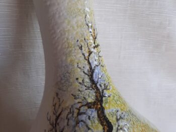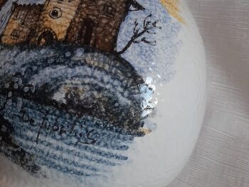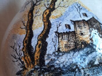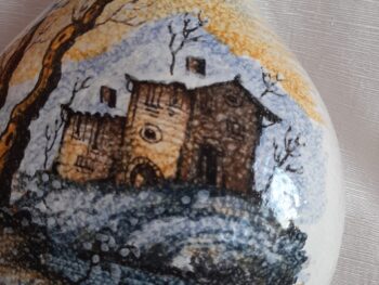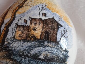 Fiasca in ceramica di castelli bocciardata dipinta a mano, raffigurante panorama invernale.
