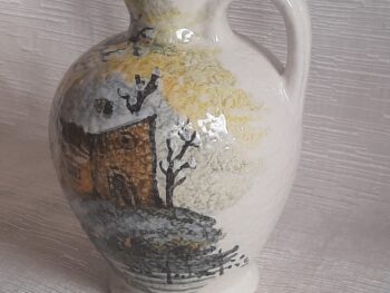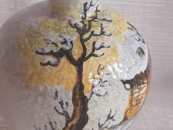 Fiaschetta in ceramica di castelli bocciardata dipinta a mano raffigurante panorama invernale.