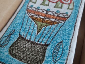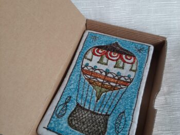 Mattone in ceramica di castelli bocciardata realizzato e dipinto a mano da maestri ceramisti castellani. Raffigurante il terzo cielo di Castelli. Mongolfiera. Misure cm 8×13