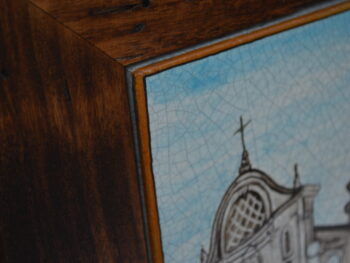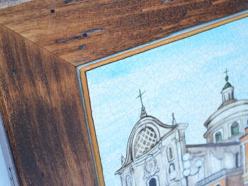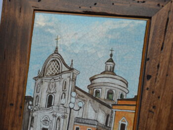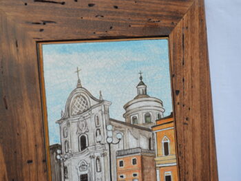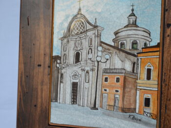 Il dipinto su ceramica rappresenta la piazza dell’Aquila,
