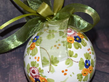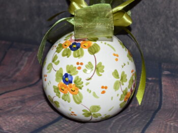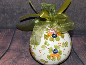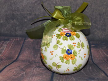 Questa palla ceramica di castelli è un prodotto artigianale realizzato con cura e maestria. La superficie della palla è dipinta a mano con motivi floreali e geometrici, tipici della tradizione ceramica di Castelli, un paese dell’Abruzzo famoso per la sua produzione artistica. La palla ha un foro per poterla appendere con un nastro o una corda. Questa palla ceramica è ideale per regali natalizi, bomboniere, decorazione della casa o dell’albero di Natale. È un oggetto unico e originale, che porta con sé il fascino e la bellezza della cultura abruzzese.