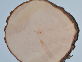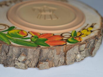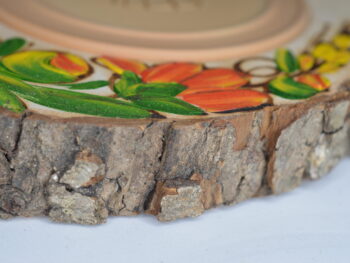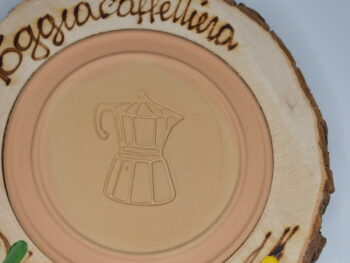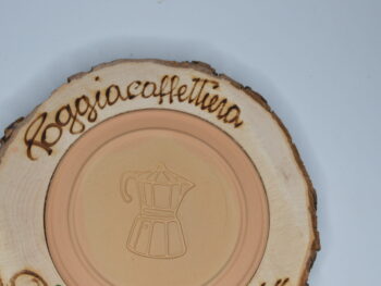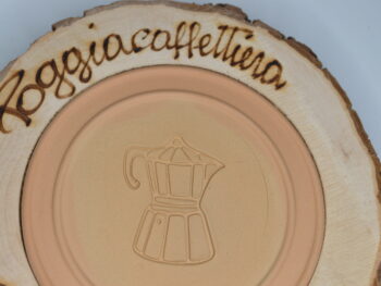 Poggiacaffettiera in legno e corteccia con piastrella in terracotta.