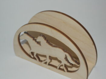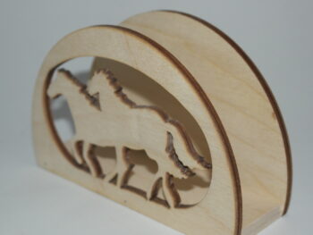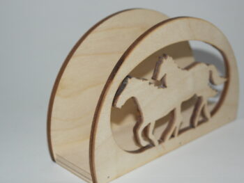 Il portatovagliolo in legno è realizzato in faggio di alta qualità, con una sagoma semicerchio ed una incisione laser a forma di cavalli. Questo prodotto artigianale è interamente made in Italy e le sue misure sono di 15 cm di lunghezza, 5 cm di larghezza e 10 cm di altezza.