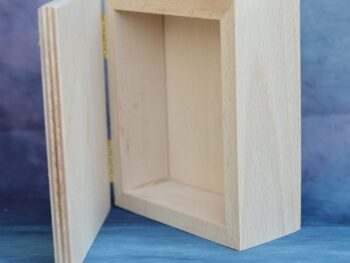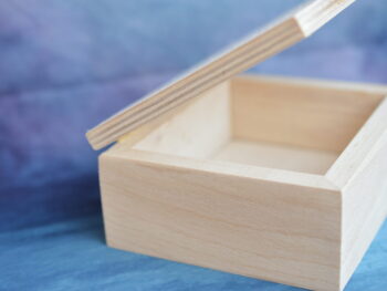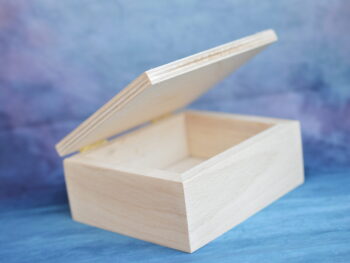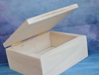 Scatola in legno artigianale di forma rettangolare, lavorazione semplice e artigianale, con venature del legno visibili e una finitura naturale che esalta la texture del materiale. Le dimensioni sono approssimativamente 12 cm di lunghezza, 10 cm di larghezza e 5 cm di altezza. È un oggetto che potrebbe essere utilizzato per conservare piccoli oggetti o gioielli, bomboniere, lavori di decoupage.