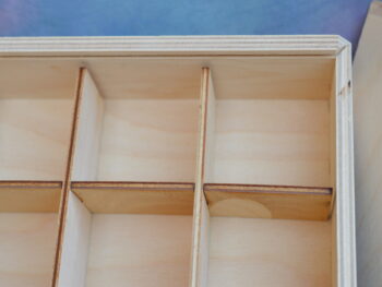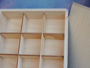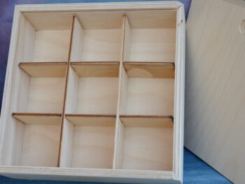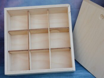 Design: La scatola presenta un coperchio scorrevole che rivela nove scomparti interni. Questi scomparti sono separati da divisori in legno rimovibili, consentendo di personalizzare lo spazio interno. Se i divisori vengono tolti, l’intera superficie della scatola può essere utilizzata come uno spazio aperto.