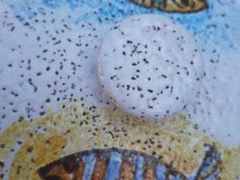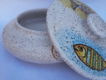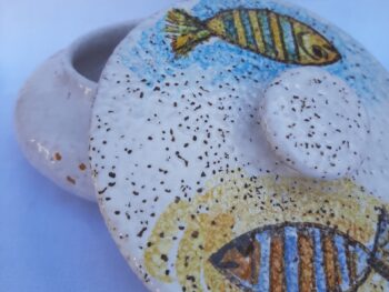 Scatola tonda in ceramica di castelli bocciardata raffigurante il terzo cielo di Castelli.