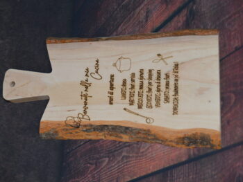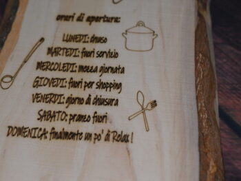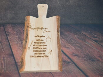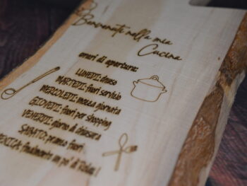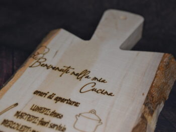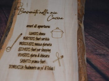 Decorazione: Incisioni decorative sulla superficie, che includono motivi di utensili da cucina e testi simpatici in italiano che riflettono un’atmosfera accogliente e familiare