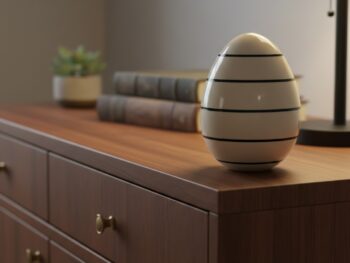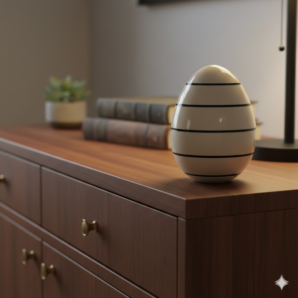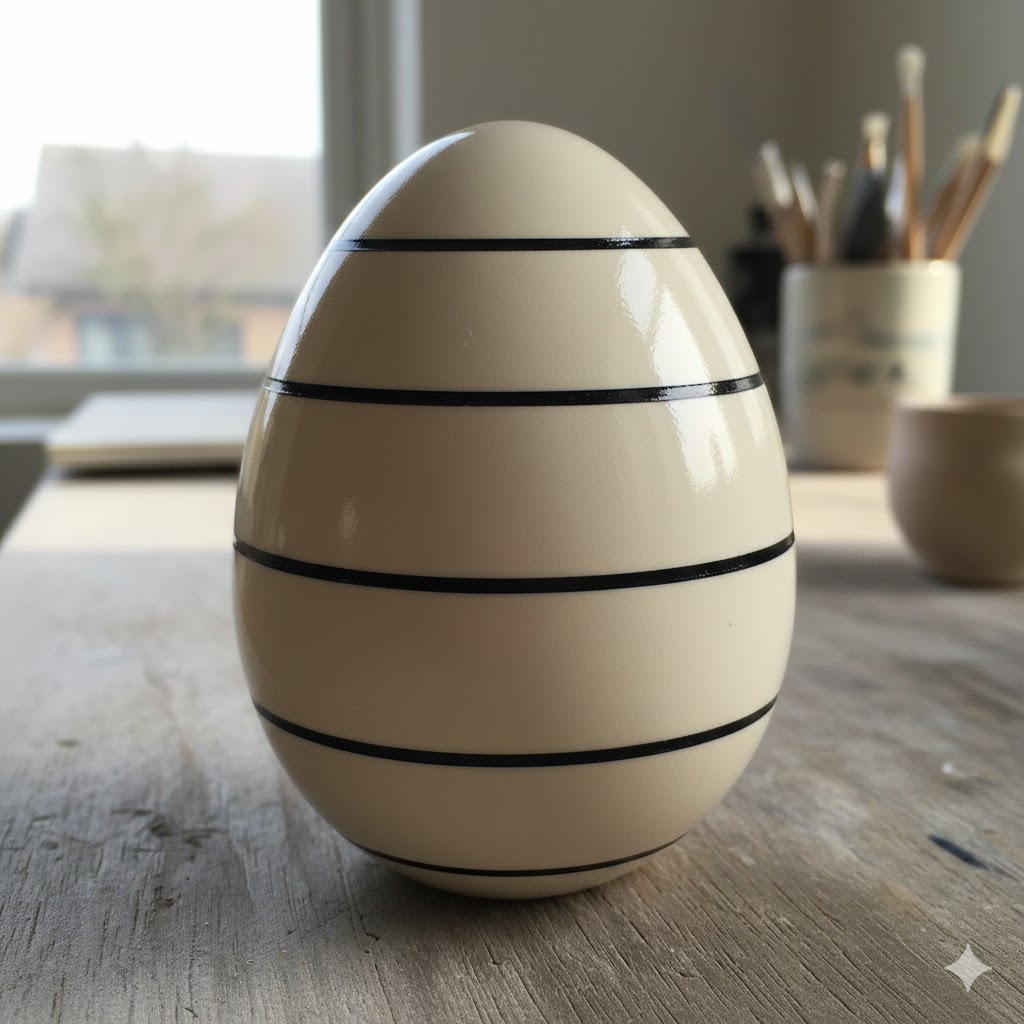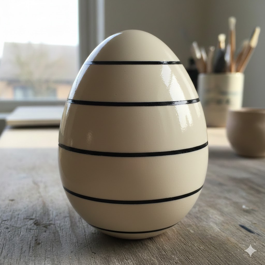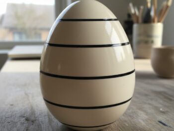 Aggiungi un tocco di eleganza contemporanea alla tua casa con questo uovo decorativo in ceramica. Caratterizzato da una finitura lucida color crema e sottili righe nere orizzontali dipinte a mano, questo pezzo incarna lo stile minimalista “Nordic” o “Scandi”.