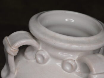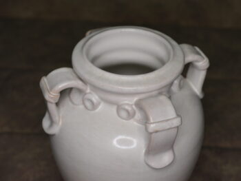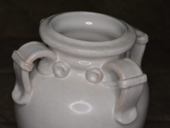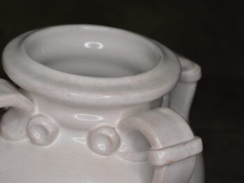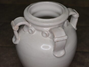 Questo è un bellissimo vaso in ceramica di Castelli con quattro manici bianchi. Si tratta di un prodotto artigianale realizzato a mano nella città di Castelli, in Abruzzo, famosa per la sua tradizione ceramica che risale al XVI secolo. Il vaso misura 24 centimetri di altezza e ha una capacità di circa 2 litri. È un oggetto di grande valore artistico e culturale, che può essere usato come elemento decorativo o come contenitore per fiori o altri oggetti