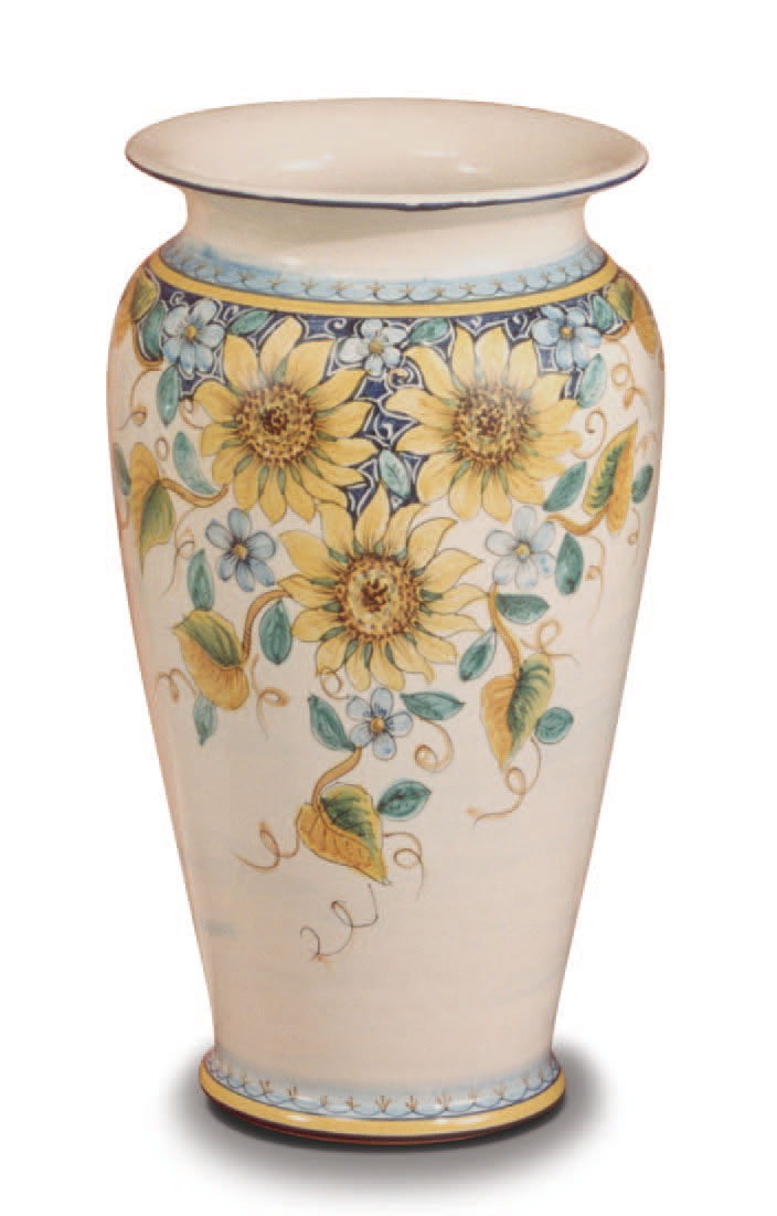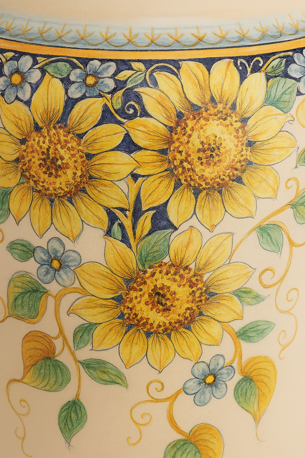 Vaso portaombrelli in ceramica di Castelli, dipinto a mano da maestri ceramisti, è un prodotto artigianale made in Italy. Le sue misure sono di 30 cm di diametro e 51 cm di altezza. Il soggetto raffigura fiori di girasole. Questo vaso è un’opera d’arte unica e ideale per decorare il tuo ambiente con stile e tradizione italiana. Realizzato e dipinto completamente a mano su tutta la superficie. Oggetto unico